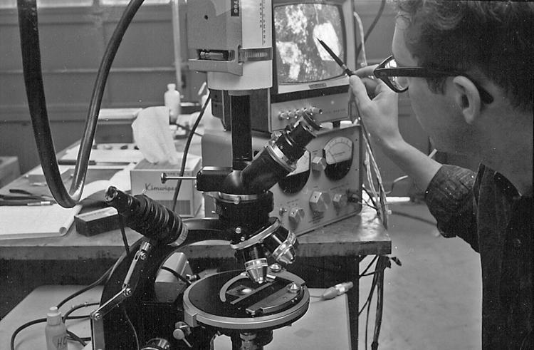 Photo caption: USGS astrogeologist Jerry Schaber examines rock slices in this photo of the lab from July 7, 1965.
