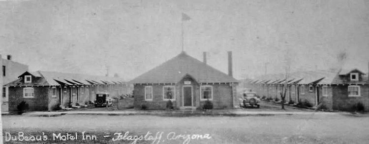 Motel Dubeau at 19 West Phoenix is Flagstaff’s first Route 66 motel. Built in 1929 for the new breed of traveler, “auto tourists,” the motor hotel (later shortened to “motel”) catered to those lured by the open road. Note the U-shaped plan of the motel, which allows auto adventurers to park next to their room and then quickly move luggage from their car to their guestroom. Owner Albert Eugene Du Beau believed the innovative courtyard design was the first of its kind. In the 1930s, when the realigned Route 66 no longer passed his door front, Mr. Du Beau competed for lost business with an 80-foot tower sign.