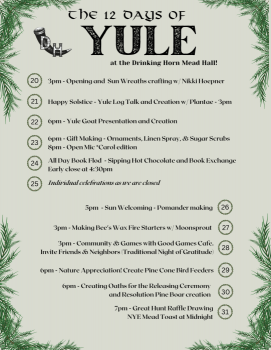 Yule is a celebration of the return of the sun (Winter Solstice) and a time of gathering with friends and family during the longest nights of the year. At the Drinking Horn Mead Hall, we invite all to join us for crafts, stories, and fellowship with a fun and creative event for each day. This is a great way to escape the hustle and bustle of the holiday and just enjoy each others company while discovering new traditions and making connections to old. All events are free to attend. See a complete schedule of events at Drinkinghornmeadery.com/Yule