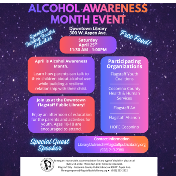 April is Alcohol Awareness Month. Learn how parents can talk to their children about alcohol use while building a resilient relationship with their child. Enjoy an afternoon of education for the parents and activities for youth. Ages 10-18 are encouraged to attend. Participating organizations include Flagstaff Youth Coalitions, Coconino County Health and Human Services, Flagstaff AA, Flagstaff Al-anon, and HOPE Coconino. Join us for a special guest speaker at the end of the program - you won't want to miss it.