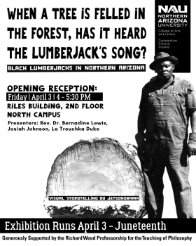 When a Tree is Felled in the Forest, has it Heard the Lumberjack’s Song? Black Lumberjacks in Northern Arizona. A Visual exhibition including storytelling by Jetsonorma, Rev. Dr. Bernadine Lewis, Josiah Johnson, La Trouchka Duke, and art by Chip Thomas. Hosted by thenRichard Wood professorship for the Teaching Of Philosophy and the ACM 210 Arts and Cultural Management class in the College of Arts and Letters. #CALisHistory #CALisCreative #CALisArt