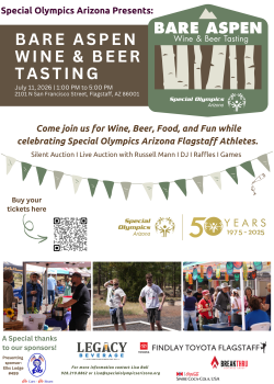 Special Olympics Arizona is excited to announce that our Bare Aspen Wine and Beer Tasting has moved to July 11th. Mark your calendars for this new date and join us to eat, drink, dance, and enjoy the beautiful weather with our local Flagstaff athletes. We're proud to say the 100% of all proceeds stay locally in Flagstaff for our athletes and programs.