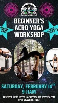 Join us for a beginner's Acro Yoga Workshop February 14th 9-11am! Register early- spaces are limited https://acroyogadsb.rsvpify.com/