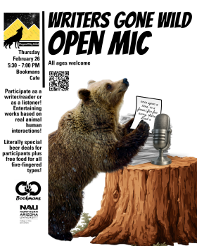 Last month, Flagstaff writers enjoyed a workshop with writing prompts themed around real world animal-human interactions. This month, we are hosting an open mic for those who participated last month as well as other writers – all around the theme of animals and humans sharing the world around us. Truth? Fiction? Poetry? Give us what you’ve got. Meet up with your community, read, or listen to your friends and neighbors sharing their writing. Historic is offering some beer discounts just for us and we have free food for all non-bears!