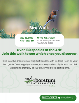 Step into The Arboretum at Flagstaff Gardens with Dr. Celia Holm as your bird guide. Don't forget your water, camera, and comfy shoes - the bird walk starts promptly at 7:30 am. Limited to 15 participants.