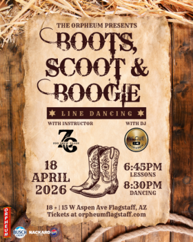 The Orpheum Presents Boots, Scoot & Boogie - A Night of Line Dancing and Country Music Favorites with ZooCrew Dance and N'Cue Entertainment at The Orpheum Theater in downtown Flagstaff, AZ!