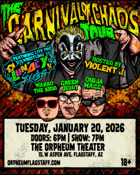 Psychopathic Records Presents Juggalo Championship Wrestling Hosted by Violent J featuring: Wakko the Kidd, Green Jelly and Ouija Macc at the historic Orpheum Theater in downtown Flagstaff, AZ!