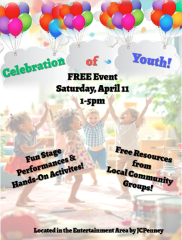 Join us for an exciting Celebration of Youth Event filled with energy, creativity, and free family fun for all ages! Live performances Interactive activities Music & entertainment Free resources Giveaways & moreBring your friends and family and come experience a day dedicated to celebrating the spirit, talent, and future of our youth. Located in the Entertainment Area by JCPenney Saturday, April 11 1-5pmLet’s come together to inspire, uplift, and celebrate the next generation! #CelebrateYouth #CommunityEvent #FamilyFun