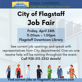 See current job openings, learn how to create a resume and cover letter, and speak with representatives from Human Resources, Flagstaff Public Library, Water Services, Public Works, and other City departments. Plus, learn about what benefits are offered by the City of Flagstaff! One-on-one resume help will be running throughout the event. To sign up for a session, call 928-213-2332 or visit the Downtown Library Information Desk starting Monday, Apr. 20th. To request a reasonable accommodation for any type of disability, please call 928-213-2330. Three days prior notice is requested.