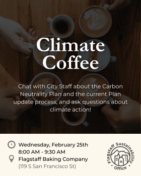 There's nothing better than coffee and a good conversation! Join Jenny and Jamie on 1/22 for a chat about the Carbon Neutrality Plan. They'll be at Flagstaff Baking Company from 8:00-9:30 AM to answer questions and connect with the Flagstaff community!