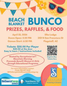 Please join us at our oceanside cabana in Flagstaff and play Beach Blanket Bunco! Feast on luau-themed food, bid on auction items from local businesses, and enter to win one of our grand prizes! No bunco experience necessary. Help us help women and girls live their dreams! We Are Soroptimist. A global volunteer organization that provides women and girls with access to the education and training they need to achieve economic empowerment, specifically those facing significant obstacles.