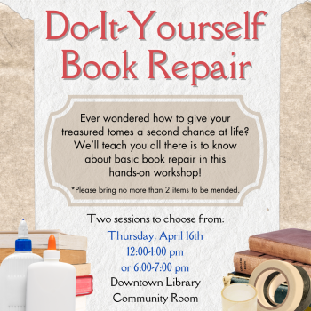 Ever wondered how to give your treasured tomes a second chance at life? We’ll teach you all there is to know about basic book repair in this hands-on workshop! You may attend one of two sessions on April 16th: 12:00 - 1:00pm 6:00 - 7:00pm Both sessions are held in the Downtown Library Community Room *Please bring no more than two items to be mended. To request a reasonable accommodation for any type of disability, please call 928-213-2330. Three days prior notice is requested