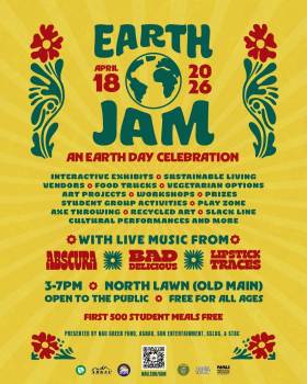 Celebrate Earth Day with live music performances and activities for the whole family! We'll have live performances from Abscura, Bad Delicious, and Lipstick Traces!! This Earth Day celebration will have vendors, food trucks, workshops, cultural performances, interactive exhibits, and more!!If you're interested in tabling at Earth Jam, fill out the form linked in this posting! This form is open to clubs, NAU organizations, and vendors/businesses!! Message us @sunentertainment on Facebook and Instagram for more details.