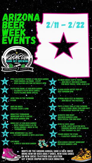 2/14 DSB @AZ Strong Beer Fest, Valentine's Day Acro Yoga-Beaver Taproom 9am 2/15 Pints & Poses Yoga 10:30-11:30am in the taproom, Acoustic Emo Night 6-9pm at DSB Beer Garden, Beer Special for Emo Night 2/16 Beer themed Bingo Night at the DSB Beer Garden 5:45pm 2/17 Taco Tuesday all day. Vinyl Night 6pm at DSB Beer Garden, highlight a DSB Brewer 2/18 Wing Wednesday all day, $12 Fight Special at both DSB locations 2/19 TAPP'D Trivia 7pm at DSB Beer Garden 2/20 Live music at DSB Beer Garden 6-8pm 2/22 Pints & Poses Yoga 10:30-11:30am in the taproom