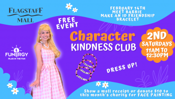 It's Character Kindness Club with a different beloved Character and craft each month! February Character Kindness Club welcomes Barbie! Located in the Entertainment area by JCPenney. Dress up as your favorite character, enjoy a FREE Photo Experience, and take home a craft.February Craft: Make & Take an ID Bracelet Plus, show a mall receipt or donate $10 to this month's charity for face painting! All activities and photo activations are FREE and while supplies last! See you there! And save the date!March welcomes Bluey! *exact characters and appearance dates are subject to change