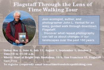 Visit key locations highlighted in his book "The San Francisco Peaks and Flagstaff Through the Lens of Time." Discover what repeat photography can show us about changes in our mountain town and the San Francisco Peaks over the past 150 years. Walks begin at Bright Side Bookshop, 18 N. San Francisco Street in Flagstaff. The event is free, but registration is required: email Soulstice Publishing at lensoftime@soulsticepublishing.com to sign up.