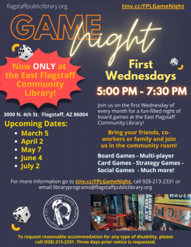 Game Night at East Flagstaff Community Library Join us for an evening of games every first Wednesday! There will be a wide collection of board games and card games at your disposal. We will have a selection of games available, and sometimes players bring their own as well to play with others. Learn to play a new game or play an old favorite. The possibilities are endless! Want to host your own game night at home? Check out the Library's board game collection here. Registration is not required, but appreciated to gauge participation and attendance. If you register you will receive a reminder email of the event the day before. For more information call 928-213-2331 or email libraryprograms@flagstaffpubliclibrary.org To hear about all our upcoming programs, sign up for our weekly email blast at tiny.cc/fplnewsletter