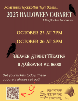“Bubble, bubble, cabaret trouble! FlagShakes brews up a spellbinding night of music, mischief, and monsters. Little Shop, Ghostbusters, and Shakespeare’s own witches share the stage in this resurrection of a cherished Flagstaff Music Theatre tradition. Come for the chills, stay for the charm—where every song is a spell and every laugh is magic.”
