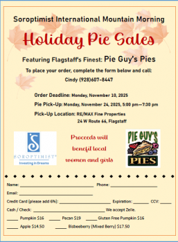 Support a Sweet Cause This Season! Soroptimist International of Mountain Morning is hosting a Holiday Pie Sale featuring handcrafted pies from Flagstaff’s Pie Guy! Choose from a variety of delicious flavors and pick up just in time for the holidays! Buy extra, pies freeze well. Proceeds support programs that empower local women and girls.