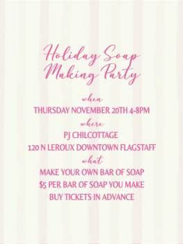 This event is for all ages and cost $5 per bar of soap you want to make. We have shapes and designs of all kinds with ingredients that are 100% vegan - the same formula as our famous handmade Primal Elements soap. Buy your tickets in advance on our website www.pjchilcottage.com. Be sure to select your desired hour-long time slot between 4:00pm-8:00pm. Limited quantity available per time slot!