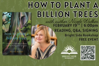 About the Book: When Nicole Walker was molested and had an abortion at age 11, the distance between her and the world grew until she couldn't imagine a future place for her anywhere. In How to Plant a Billion Trees, Walker tries to understand why her whole life didn't fall apart, as was predicted. As she pieces together her story, she finds that it was thanks in no small part to her mother, her sisters, her friends who did not let the sexual abuse to define her. In this candid portrayal of a young girl, Nicole Walker writes about how, thanks to her family, her friends, and the mountains of the Wasatch, Cascades, and San Francisco Peaks, she reknit herself into the fabric of a supportive culture. Employing the forest as a model to understand how to reconnect her life with the world, Nicole studies the way that ecosystems anticipate, react, and support each small part of the whole. As she learns more about ecology, she discovers that in a healthy forest, even the gritty, decaying elements contribute to the health of the forest. The process of rebuilding the self into a community parallels the process of a forest's growth. To apply that lesson to the human ecosystem, Nicole realizes that even the hard-to-stomach stories need to be told, and, with air, that grit is transformed into something alive and new. About the Author: Nicole Walker is the author of Processed Meats: Essays on Food, Flesh and Navigating Disaster (2021) Sustainability: A Love Story (2018) and the collaborative collection The After-Normal: Brief, Alphabetical Essays on a Changing Planet. (2019). She has previously published the nonfiction collections Where the Tiny Things Are (2017), Egg (2017), Micrograms (2016), Quench Your Thirst with Salt (2013), and a book of poems, This Noisy Egg (2010). She edited for Bloomsbury the essay collections Science of Story (2019) with Sean Prentiss and Bending Genre: Essays on Creative Nonfiction (2013) with Margot Singer. She is the co-president of NonfictioNOW and is the recipient of a National Endowment for the Arts award and a noted author in Best American Essays. Her work has been most recently published in the New York Times, Longreads, and Ploughshares, among other places. She teaches at Northern Arizona University in Flagstaff, AZ and serves as the Crux Series Editor for University of Georgia Press. Books will be available for purchase at the event. We encourage attendees to buy their copies from Bright Side Bookshop to support the author and our local literary community. This event is free and open to the public! No RSVP required.