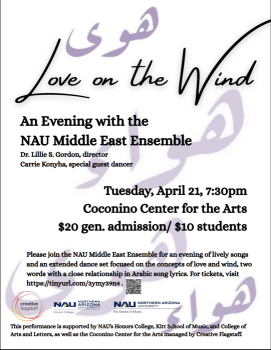 Founded in 2023, the NAU Middle East Ensemble is a group of twenty Northern Arizona University students, faculty, and Flagstaff community members, directed by Dr. Lillie Gordon. The ensemble performs music from throughout the Middle East. For this performance, our repertoire focuses on the concepts of love and wind, two words with a close relationship in Arabic poetry and song lyrics. We are pleased to be joined by world-class guest dancer Carrie Konyha for an extended set.