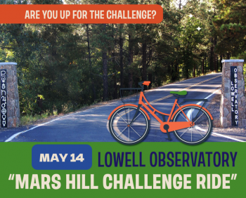 SCHEDULE OF EVENTS posted! https://flagstaffbiking.org/flagstaff-ride-your-bike-week/ Join the Biking Challenge. Ride your bike Log your ride Win prizes ——————————— Mars Hill Road …. yep, you probably know it, the paved ½-mile winding climb from Thorpe Park to the scenic overlook and then up to Lowell Observatory that beckons cyclists to pit their aerobic prowess against its steep 10-12% grade. As a regular BTWW work site participant, Lowell Observatory is sponsoring the “Mars Hill Challenge Ride” again this year as a featured event. Ride anytime between 12 pm and 5 pm on May 14th, we challenge local cyclists to bike up Mars Hill to the Marley Foundation Astronomy Discovery Center and experience first-hand what Lowell BTWW riders contend with all week long. The reward? A free Buy One, Get One (BOGO) guest pass to Lowell Observatory, and a refreshing bottle of water. Just show your bike helmet to the front desk greeter in the Astronomy Discovery Center when you reach the top. For directions and questions contact info@lowell.edu or 928-774.3358.