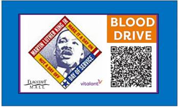 Located in Retail Suite A003, next to JCPenneyMonday, Jan 19th 11am-4pmTuesday, Jan 20th 1pm-6pmTo schedule an appointment, scan the QR code or visit vitalant.org (Enter Blood Drive Code: FLGmall). All donors can enter a drawing for a Flagstaff Mall gift card.Donate and receive a voucher for a one-day gate entry to the Renaissance Festivaland a $10 gift card (must use code JANBONUS-2026-V).Get a chance to win a $500 gift card, opt-in required! Thank you for your generous donation to save lives!