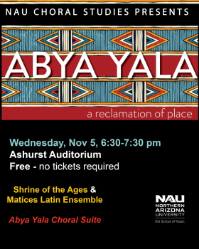Four members of Matices Latin Ensemble—two from the U.S. and two from Chile—will be joining NAU Choirs for the California premiere of Abya Yala (“The Land in Its Fullness” or “Living and Flourishing Land"). Abya Yala draws on poetry by five Indigenous poets across Latin America who have experienced being othered. The music includes traditional folk and Indigenous music as well as Latin American ensemble in styles from each poet’s region.