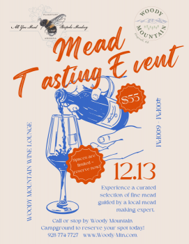 The oldest known alcohol to human kind. Come learn about this elixir of the gods while tasting a variety of our dry meads, followed by balancing with acids, tannins and spices. You’ll learn the process of making this honey wine, getting an insider’s understanding to what’s involved. Pre-Registration is required. Register by calling 928-774-7727 or by stopping by Woody Mountain Campground. Registration closes Wednesday, 12/10 at 5pm.