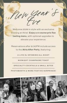 Atria will be offering a 4 course prix fixe, choice of tasting menu for New Year's Eve -210$ per person with supplemental offers to elevate your dining experience to the next level!
