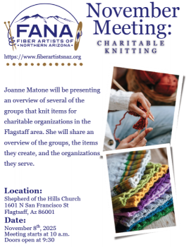 Join us for the Fiber Artists of Northern Arizona monthly guild meeting at our NEW LOCATION at Shepherd of the Hills! Doors open at 9:30 and meeting begins at 10:00. Feel free to bring your completed or in-progress fiber-arts project for show and tell. Then, We will have a presentation on charitable knitting opportunities. Guests always welcome! Entrance is the double glass doors next to the green door.