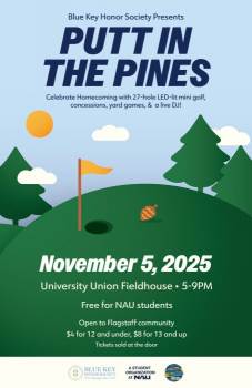 Celebrate NAU Homecoming with Blue Key’s Putt in the Pines, an exciting mini golf experience happening on Wednesday, November 5th, 2025, from 5 PM to 9 PM in the Union Fieldhouse! Step into a vibrant mini golf course where the fun is just beginning. Whether you're an experienced golfer or just looking for a good laugh with friends, this event is designed for everyone to enjoy. As you navigate your way through each glowing hole, you’ll be treated to the upbeat sounds of a live DJ spinning your favorite hits and keeping the energy high all night long. But that’s not all, we’ve got an incredible variety of free snacks, including delicious snow cones, buttery popcorn, and more to keep you fueled up for fun. Don’t forget to stop by our themed photo booth, where you and your friends can Channel Your Flannel in true NAU fashion. Snap a few pics to commemorate Homecoming week and show off your Lumberjack pride! Putt in the Pines is the perfect midweek celebration where you can relax, connect with others, and enjoy an evening packed with entertainment, games, and good vibes. Bring your friends, bring your flannel, and join us for a night that brings together everything we love about NAU: community, tradition, and fun. This event is open to all students and the Flagstaff community, so don’t miss your chance to be part of the Homecoming magic! NAU student entry is free, but all are welcome! Children 12 years and under enter at $4 and 13 years+ enter at $8! For our community members in attendance, please keep in mind that all tickets are sold at the door and this is a cashless event.