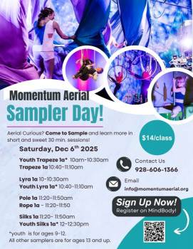 Sample Trapeze, Silks, Lyra, Rope, and Pole classes with us on December 6th, 2025. Learn the basics and join in on all kinds of fun during the 30 minute samplers for only $14 each! Take as many as you want, this is your chance to make some new aerial buddies (and maybe even make aerialists out of your already existing friends!) Youth classes are available for those ages 9-12 in Silks, Lyra, and Trapeze. Try a brand new after school activity for your energetic kiddos!