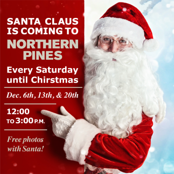 Santa Claus is coming every Saturday leading up to Christmas at Northern Pines Restaurant between 12:00 PM and 3:00 PM.