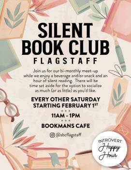 Silent Book Club Flagstaff is a community of book lovers who find joy and relaxation in spending time with people while reading whatever they want. No more stress to get a book you didn't even choose finished. Chit chat about what book you are reading (or don't), grab a drink and/or snack, then cozy on into a chair and get reading. This is a great way to break into that TBR pile you've got going! 11am-11:30am People arrive, order a drink/snack, share what they're reading, check out the word search contest (maybe win a prize!) 11:30am-12:30pm Quiet reading hour. 12:30-1pm Optional socializing, or keep reading. Or dip out and go on your merry way! That's the beauty of SBC. SBC Flagstaff will meet every other Saturday in the Bookmans Cafe. Please follow our Instagram page @sbcflagstaff to get updates and meet up times.