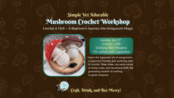 You’ll learn to crochet your own sweet little mushroom, while sipping mead and enjoying the warmth of creative community.