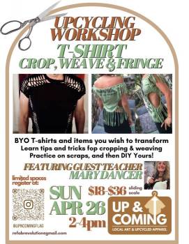 Have you been thinking about how you could be more sustainable, express your unique personality through your style, save money, and stick it to the man all at the same time?!? Here is one cool way to do all those in one shot:Upcycle your old clothes into something you are excited to wear! Come to the T-Shirt Upcycling Workshop at Up & Coming on Sunday April 26th from 2-4 pm Bring your own t-shirts (or other garments) you'd like to transform by cropping, weaving and fringing! We'll have practice fabric on hand so you can master your newly learned techniques before applying them to your fave t-shirts. Join hostess Inok plus guest teacher Mary Dancer from Sedona to learn some tips and tricks, and get expert help to make your old clothes new again! Spaces are limited so pre-registration is highly encouraged.$18-$36 sliding scale https://forms.gle/eZH8mGarpUSYqdmh8
