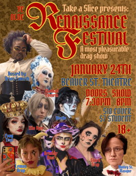 Hear ye, hear ye! Take a Slice hath returned yet again! This month we bringeth the Renaissance Faire to Flagstaff! Cometh thee down to Beaver Street Theatre to behold some marv’lous acts! We shall present performances by some of Flagstaff’s most beloved drag artists, as well as fresh new players. Art thou lacking coin for the true Ren Faire? Pay us a visit in its stead!