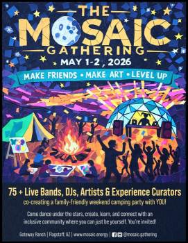 The Mosaic Gathering is a family-friendly weekend of music, creativity, movement, and connection taking place May 1–2, 2026 at Gateway Ranch near Flagstaff. Featuring 75+ live bands, DJs, artists, experienced curators, and facilitators, Mosaic is a true celebration of the creativity, expression, knowledge, and community of the Flagstaff area and beyond.