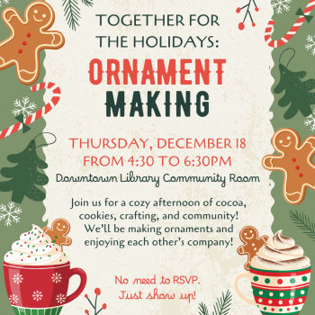 Join us for a cozy holiday event for adults and teens. Enjoy cocoa, cookies, and company while making ornaments and listening to classic Christmas music!