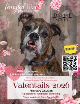 Valentails 2026 is a pet portrait fundraiser at the Flagstaff Mall, benefiting Canyon Animal Care Foundation