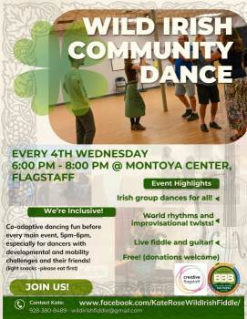 WILD IRISH (WORLD) COMMUNITY DANCE What? Dancing together, Irish dances taught and enjoyed with contemporary twists, world rhythms, and plenty of room for improvisation. Who? Everyone! No experience or partner necessary, and all ages and abilities welcome! Why? The joy of dancing! And discovering new experiences and possibilities for ourselves and our collective expression through movement. What fun! Dances are… -taught by Kate Rose based on her experience with Irish community (ceili) dancing and contact improvisation. -to live music by Wild World Irish Fiddle (Kate Rose, fiddle and Armand Ramirez, guitar). -unique and full of good vibes, synergy, and spontaneity! You won’t find this experience anywhere else. Come journey with us! Contact: Kate Rose, wildirishfiddle@gmail.com or 928-380-8489 Also see: https://www.facebook.com/KateRoseWildIrishFiddle/