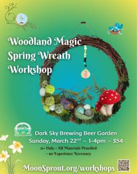 Come weave your own magical spring wreath, learn to needle felt mushrooms, decorate woolen eggs, & add moss, pom poms, Suncatchers & more! $54 Please register on the website! https://www.moonsprout.org/event-details-registration/woodland-magic-spring-wreath-workshop